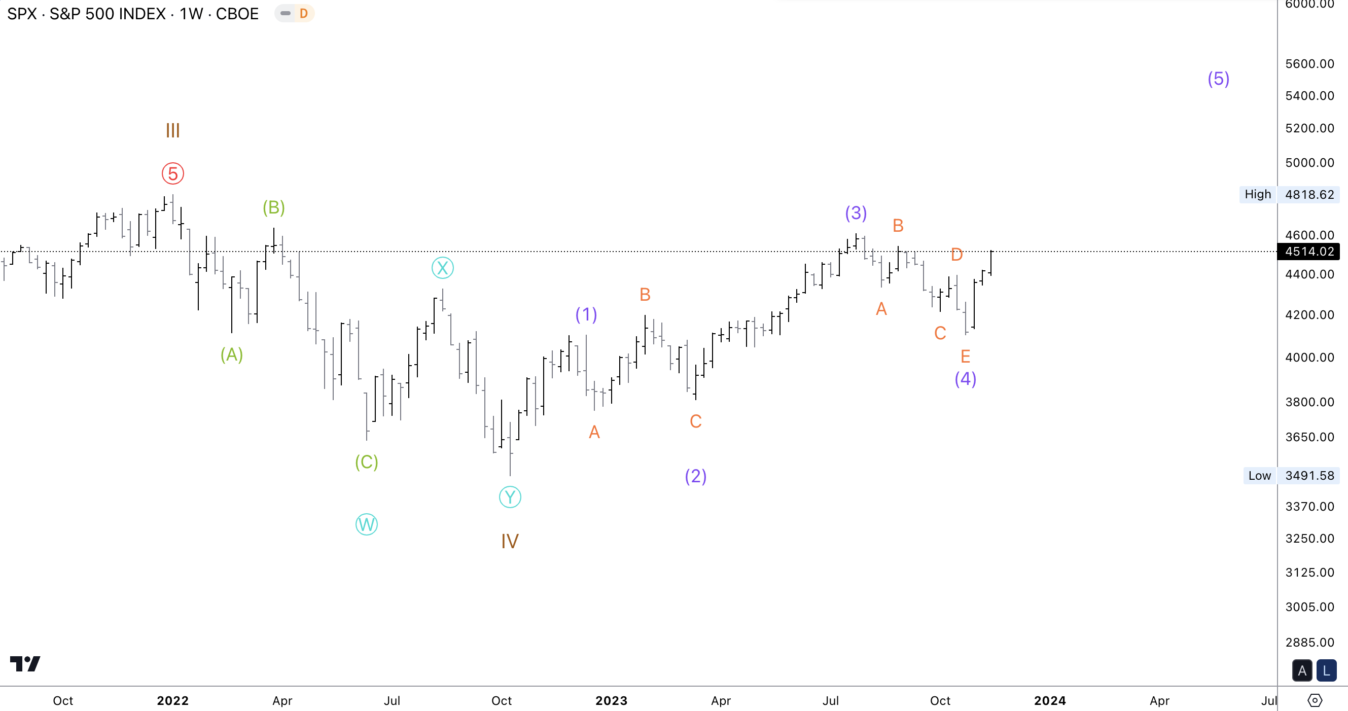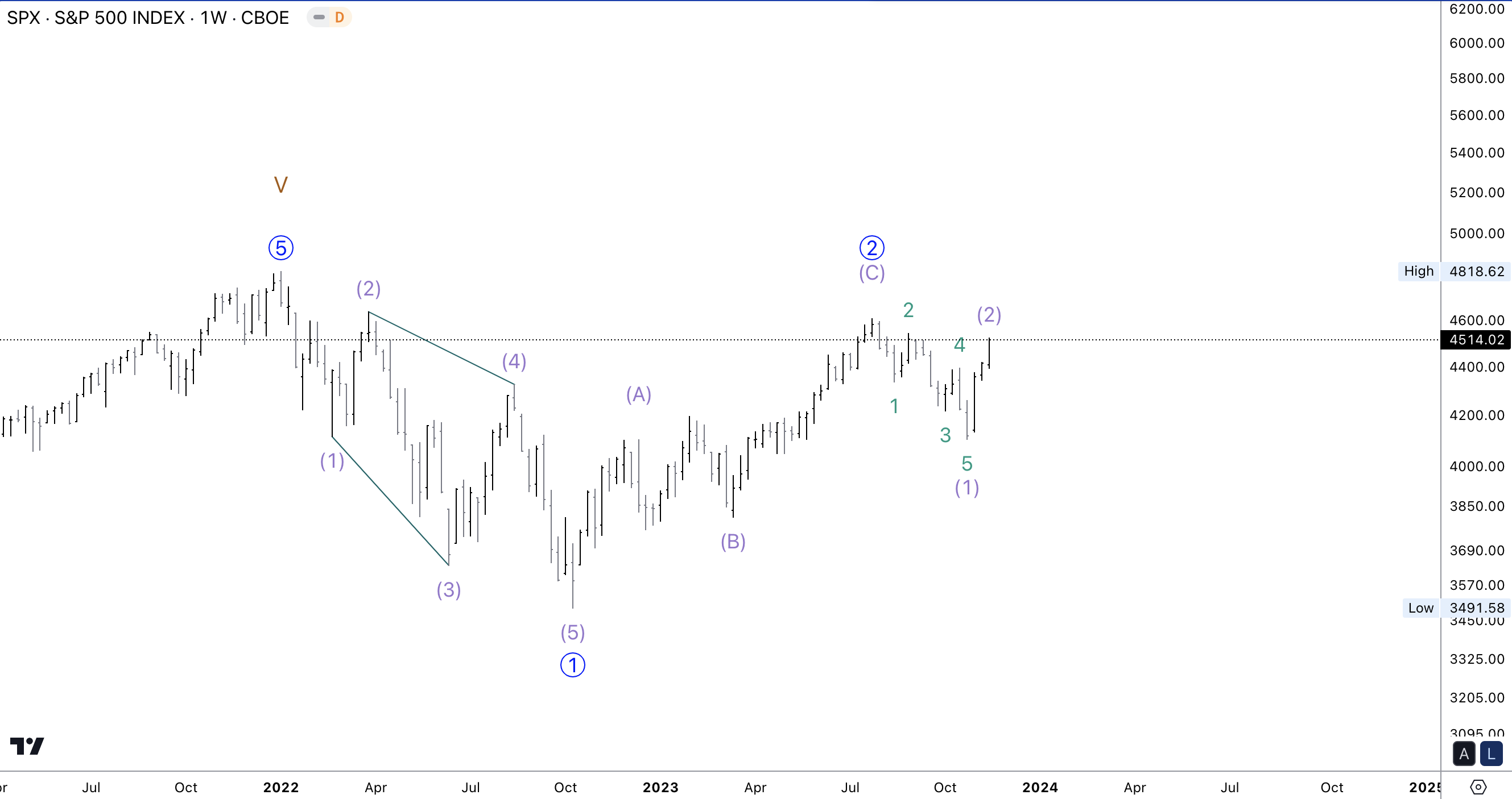Scenario 2: In this alternative scenario, the wave IV cycle might have concluded during the week of October 10, 2023, reflecting a time duration approximately 10 bars longer than the wave II cycle in 1933. As the wave V cycle unfolds, it’s crucial for this alternative that the SPX does not dip below the endpoint of wave (4) at the intermediate level, specifically at 4,103.78 points. Additionally, confirmation would be sought through a daily close above the wave (3) at the intermediate level.